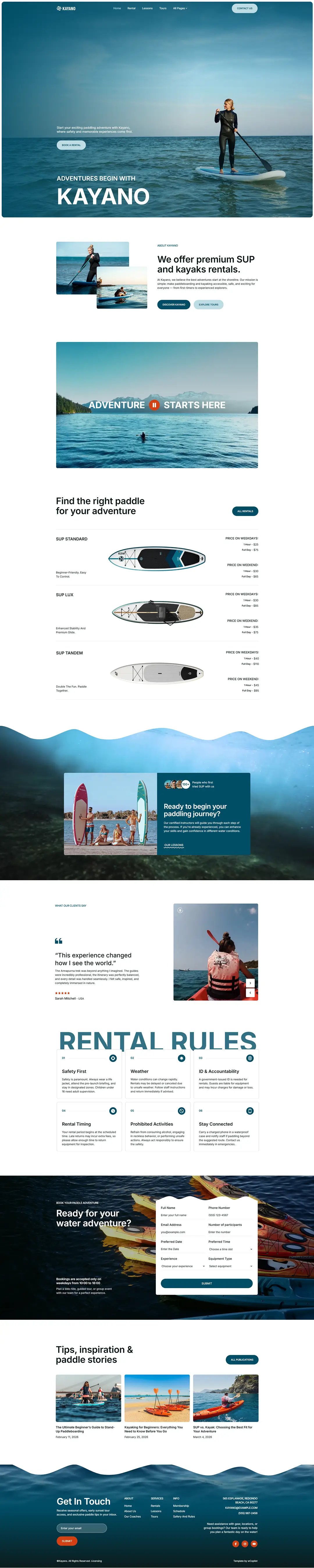 Kayano is a template crafted for outdoor and adventure-based businesses, including SUP and kayak rentals, tours, and water sports services. It features a clean, responsive system with CMS functionality for managing rentals, lessons, tours, and locations, making it ideal for experience-driven brands.