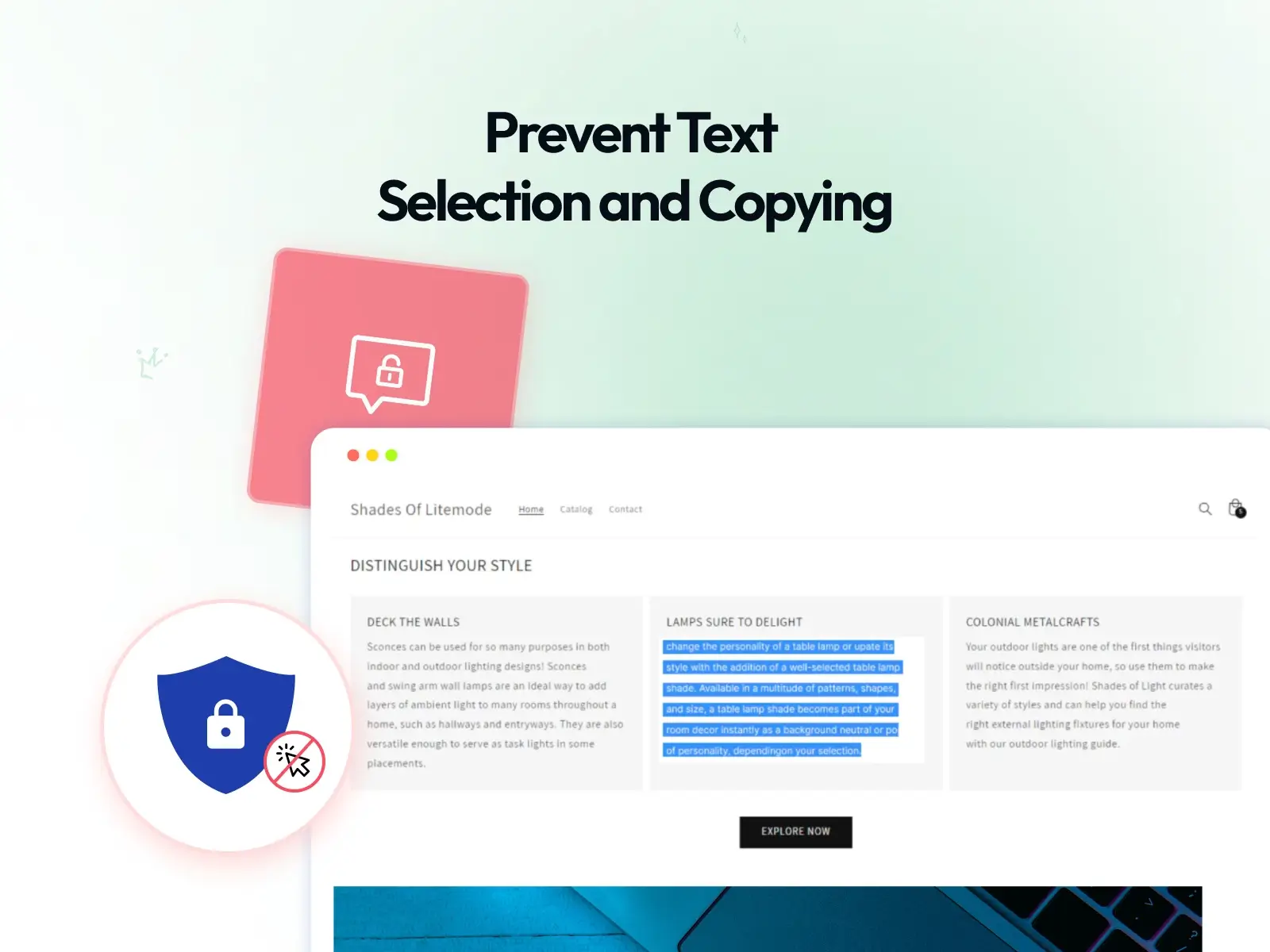 Protect your store’s content with our Content Protection plugin, designed to prevent unauthorized downloads and copying. This app offers robust anti-theft technology by disabling right-click functionality and blocking context menus, effectively deterring visitors from copying or saving your content, images, and code.