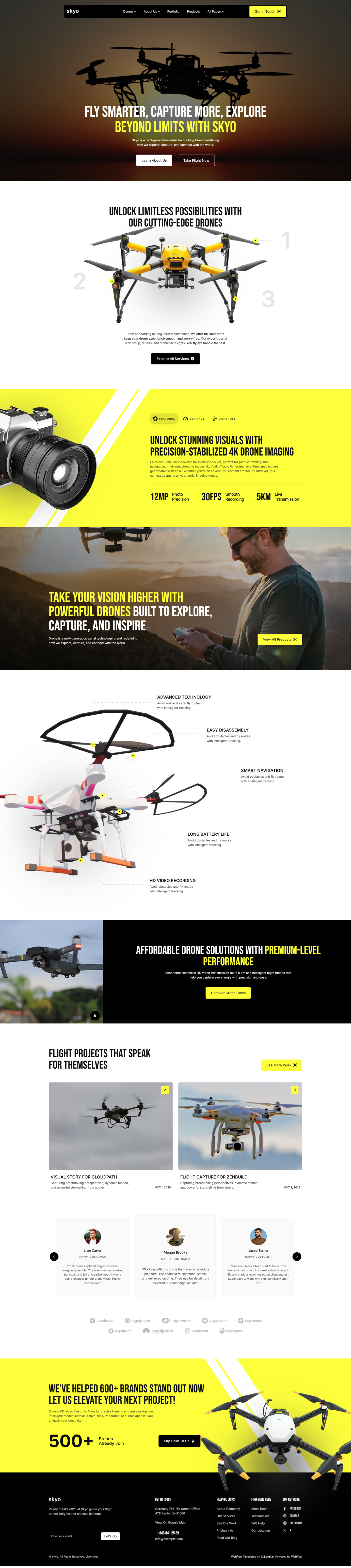 Skyo is a professional Drone Aerial Videography Webflow template, perfect for drone filming, aerial photography, videography portfolios, cinematic projects, drone services, and creative media websites.
