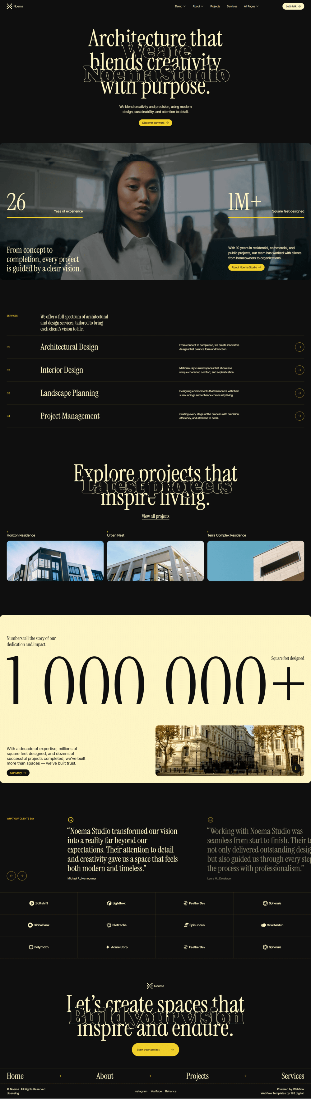 Noema is a modern, responsive Architecture Webflow template for architecture firms, studios, architects, and interior designers. Showcase projects, portfolios, and services with a professional, creative, and SEO-optimized design.