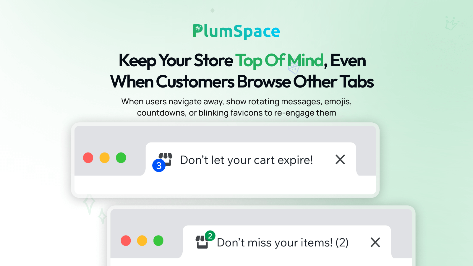 Re-engage distracted visitors with the Browser Tab app. Utilize dynamic tab animations, messages, countdowns, and reminders to bring customers back without interrupting their browsing experience.