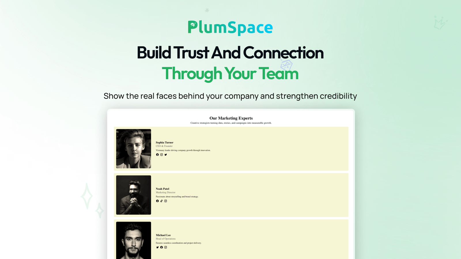 - Custom team profiles with photos and bios