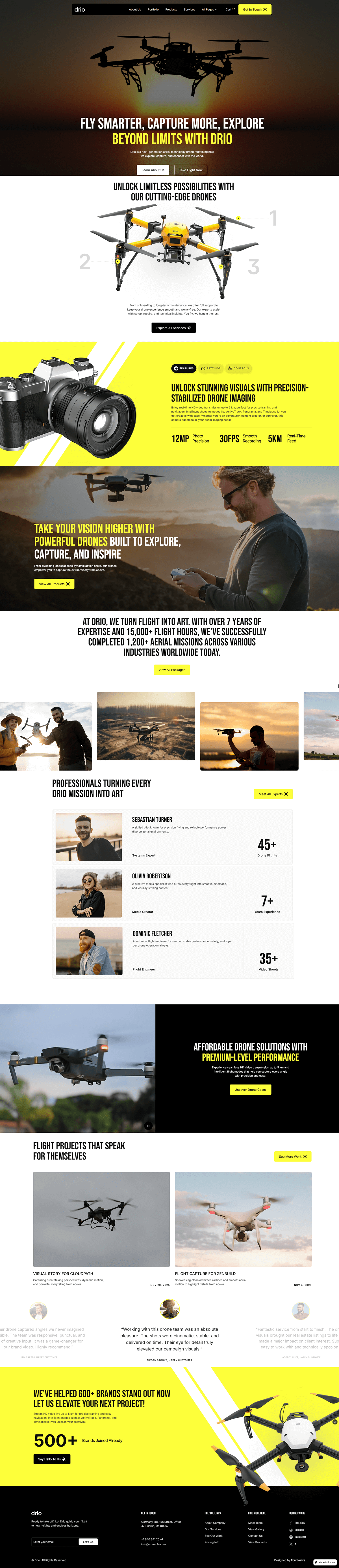 Drio is a bold Drone and Video Services Framer template built for aerial photography, videography, and media professionals. It features media-focused layouts that highlight portfolios, services, and projects with strong visual impact.