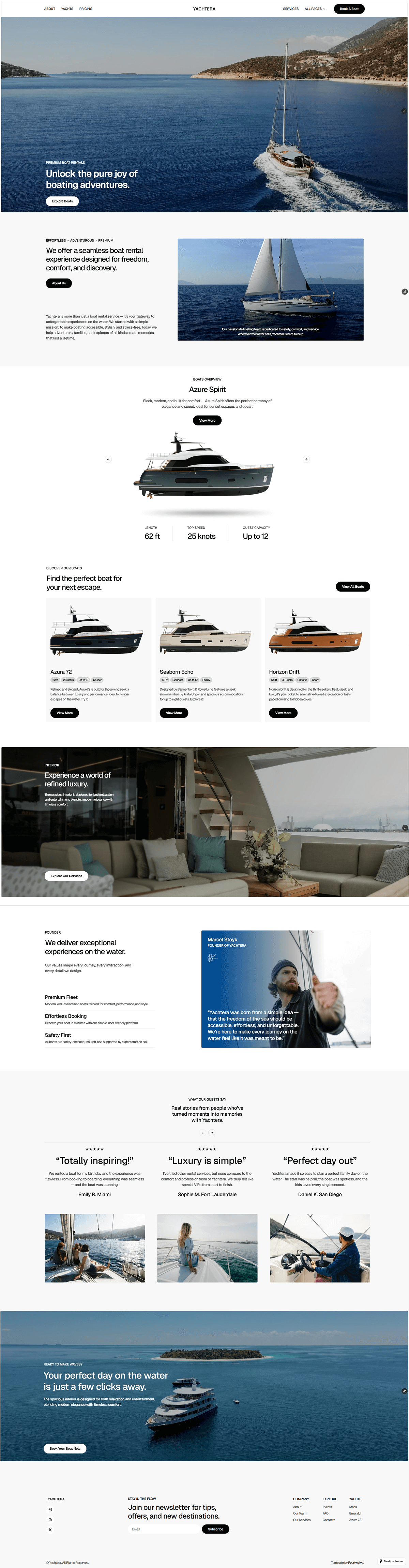 Yachtera is a premium Yacht and Boat Rental Framer template designed for charter companies and marine services. It combines elegant visuals with structured layouts to showcase fleets, services, destinations, and booking options with clarity and style.