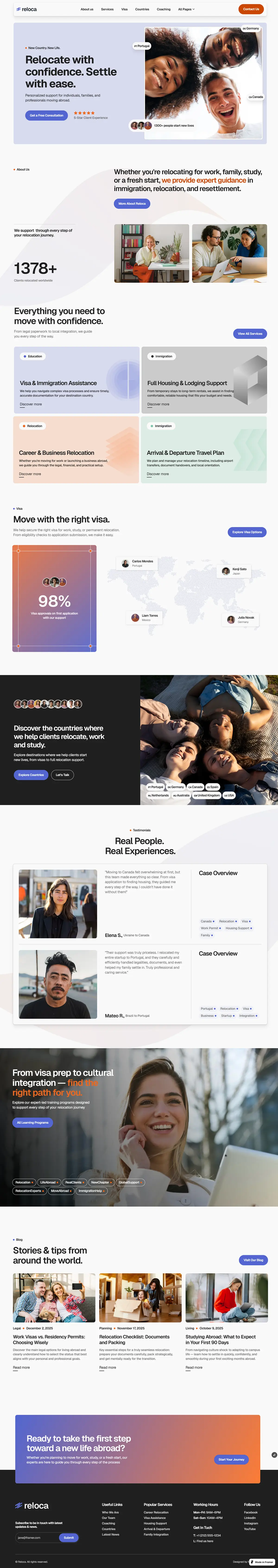 Reloca is a modern template for immigration and relocation services, including visa agencies and global mobility experts, featuring a clean layout for presenting visa assistance, relocation planning, and expat support. Built for clarity and usability, it helps users easily explore services, processes, and key information while supporting case studies and consultancy content.