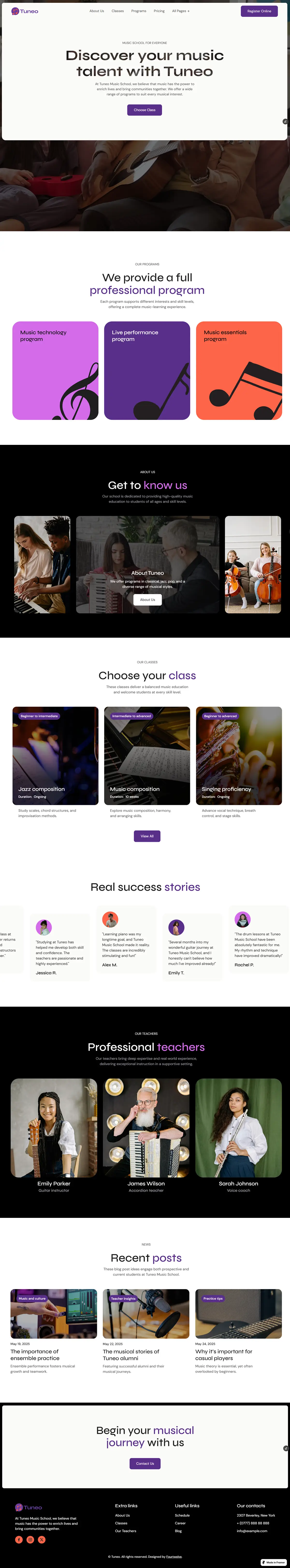 Tuneo is created for music schools and education platforms, offering a balanced mix of creative presentation and structured content. It supports showcasing programs, instructors, and educational content in a clean and accessible format.