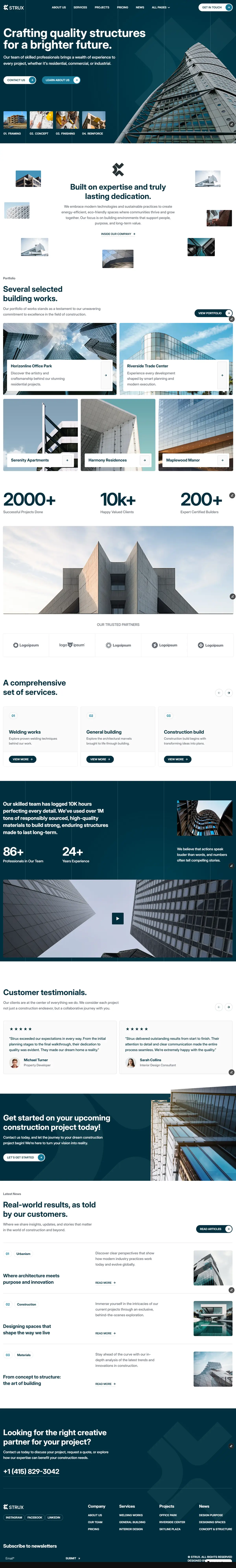 Strux is a modern template for construction and building companies, including contractors, architects, and development teams, designed to present services, projects, and expertise with clarity and confidence. Its clean, structured layout helps communicate complex construction processes and showcase large-scale work in a clear and professional way.