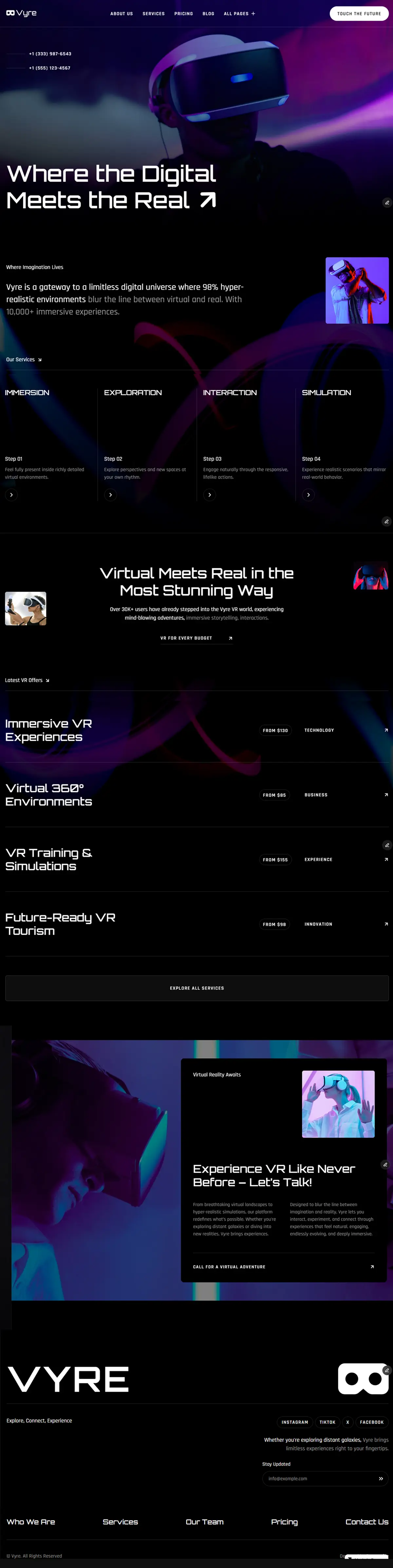 Vyre is a virtual reality services template designed for VR agencies, immersive experiences, and next-gen tech companies. It focuses on presenting complex VR solutions in a clear, engaging way, combining bold visuals with structured content to support storytelling, services, and industry insights.