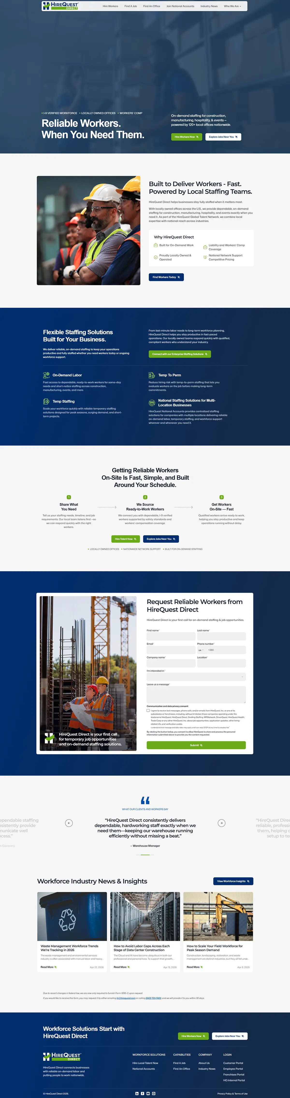 We’ve launched the new website for HireQuest Direct, a leading on-demand staffing franchise with 120+ locations in the USA dating back to 1991. HireQuest Directs is a nationwide leader of flexible staffing solutions trusted by thousands of customers each year and tens of thousands of employees. Built on a promise of service and safety, they’re dedicated to delivering the right people at the right time, guaranteed.