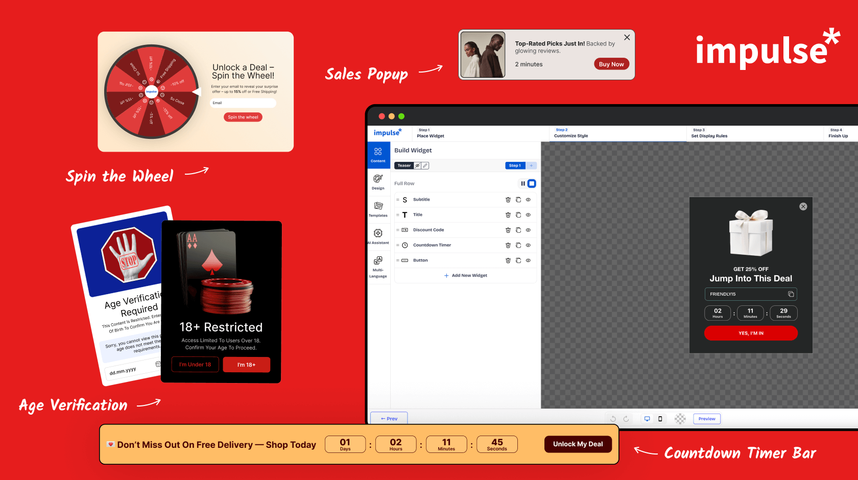 Impulse empowers online stores with tools that create engaging shopping experiences. Use Spin the Wheel for interactive offers, Sales Popups, and Countdown Timer Bars to highlight deals, and Age Verification to ensure compliance. Each app enhances the shopping experience and keeps visitors engaged with your store.